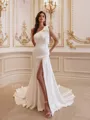 Sleeveless sheath wedding dress with a one-shoulder neckline, a bow accent, and a chapel train in charmeuse fabric.