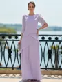 A graceful sheath Mother of the Bride dress featuring a scoop neckline and 3/4 sleeves. The dress is designed with cascading ruffles that add texture and movement, creating a stunning, feminine look. Made from lightweight chiffon, it offers a comfortable and flattering fit. The floor-length silhouette enhances the elegance and sophistication, making it an ideal choice for a memorable and stylish appearance on the big day.