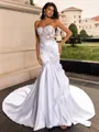This wedding dress features a form-fitting sheath silhouette with a sweetheart neckline and delicate lace appliques. The satin fabric enhances its luxurious look, while the dramatic cathedral train adds an elegant touch. The sleeveless design completes the sophisticated and timeless style, perfect for a bride who desires both elegance and grace on her special day.