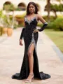 This elegant sheath dress features a V-neckline and long sleeves, offering a sophisticated and flattering silhouette. Adorned with intricate beading and sequins, the dress catches the light, adding a glamorous and sparkling effect. Crafted from luxurious velvet, the fabric provides a rich, smooth texture that hugs the body beautifully. The court train adds a dramatic yet graceful touch, perfect for formal events or weddings. Combining the softness of velvet, shimmering sequins, and a timeless design, this dress exudes modern elegance and refined glamour for any special occasion.