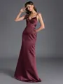 A sheath V-neck sleeveless bridesmaid dress with pleats and a floor-length satin design, featuring a corset-style bodice. This dress offers a sleek, structured fit with an elegant, flattering silhouette, perfect for a sophisticated, formal look.