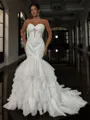 This mermaid wedding dress features a flattering sweetheart neckline and sleeveless design, beautifully embellished with intricate lace appliques. The figure-hugging silhouette is crafted from soft tulle, creating a romantic and elegant look. The court train adds a graceful touch, making this gown perfect for a bride who desires a stunning, sophisticated style with delicate detailing.