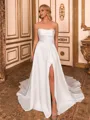 This elegant A-line wedding dress features a clean straight neckline and a timeless sleeveless design. Crafted from smooth satin, it showcases subtle pleated detailing and a structured corset bodice for a flattering fit. The flowing chapel train adds a graceful and sophisticated touch, creating a refined bridal look perfect for the special day.