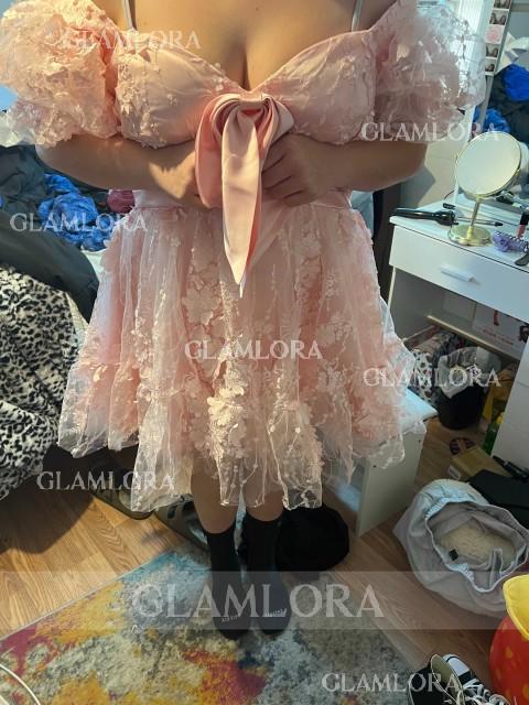 This A-line mini dress features a charming sweetheart neckline and short sleeves, beautifully adorned with intricate lace. The playful bow detail adds a touch of whimsy, while the short length enhances its youthful appeal. Perfect for tea parties, weddings, or casual outings, this dress combines elegance with a fun, feminine flair.