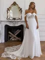This romantic A-line wedding dress features an off-the-shoulder neckline that elegantly frames the shoulders and collarbones. Crafted from flowing chiffon, the bodice is beautifully adorned with intricate lace appliques, adding delicate texture and charm. The sleeveless design enhances the graceful silhouette, while the corset waist cinches for a flattering fit. A chapel-length train completes the look with timeless elegance, perfect for a memorable wedding day.