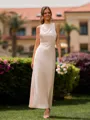 A stylish sheath bridesmaid dress with a halter neckline and sleeveless design. Made from silk like satin, this ankle-length dress offers a smooth, luxurious feel and a flattering, figure-hugging silhouette. The pleated details add texture and movement, creating an elegant and modern look, perfect for a chic and sophisticated wedding.