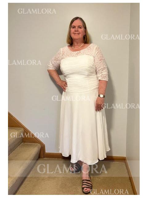 • Modest A-line Scoop 3/4 Sleeves Tea-Length Chiffon Mother of the Bride Dress