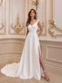 Sleeveless A-line wedding dress with a V-neck, pleated details, and a chapel train in stretch crepe fabric.