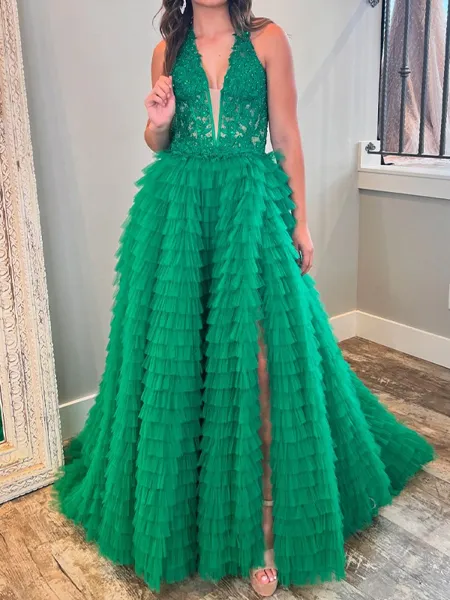 Charming A-line Straight Long Sleeves Sweep Train Tulle Convertible Corset Prom Dress With Slit $180.00