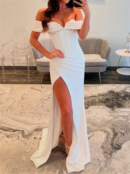 Flattering Sheath/Column Long Sleeves Off-the-Shoulder Sweep Train Evening Dress With Slit $131.00 (1)