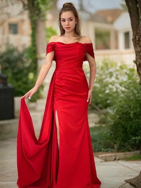 Figure-hugging Sheath/Column Off-the-Shoulder Sleeveless Sweep Train Silk like Satin Corset Prom Dress NZ$215.28
