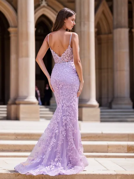 Aristocratic Sheath/Column V-neck Sweep Train Silk Like Satin Evening Dress With Appliques Lace ¥925.41