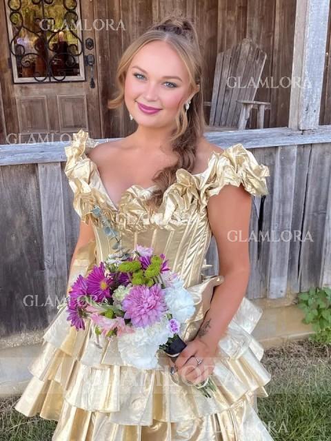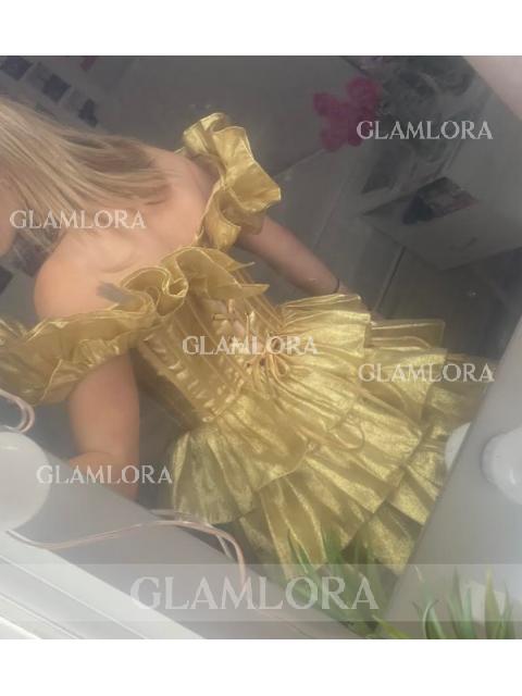 This A-line dress features an off-the-shoulder design with cascading ruffles that create a flowing, elegant look. The mini length adds a playful touch, while the corset-style bodice provides a flattering, structured fit. Perfect for a special occasion or a night out.