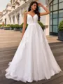 Sleeveless A-line wedding dress with a V-neck, lace appliques, and a court train in tulle fabric.