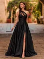 An elegant A-line dress with a one-shoulder neckline and sleeveless design, adorned with delicate lace appliques. It features a sweeping train made of tulle and includes a corset for a structured fit.