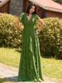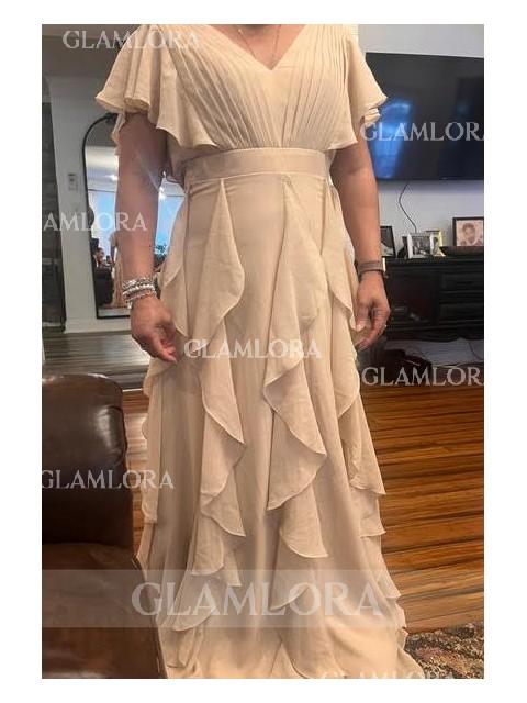 An A-line chiffon bridesmaid dress with a flattering V-neckline, short sleeves, and charming ruffle details, all elegantly flowing into a floor-length design.