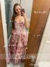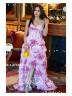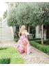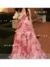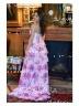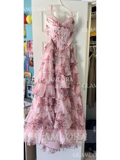 • Pink Floral Strapless Satin Corset Ball Gown with Chiffon Ruffle Skirt Slit Prom Prom Dress