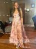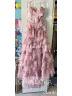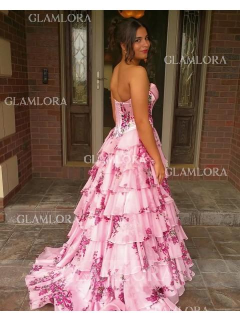 This dress is an A-line gown featuring a sweetheart neckline and a sleeveless design, creating a romantic and timeless appeal. The skirt is adorned with cascading ruffles, adding movement and volume for a dramatic effect. The corset-style bodice provides a structured, flattering fit, enhancing the waistline. With its sweep train, this dress exudes elegance and grace, making it a perfect choice for formal occasions or special events.