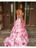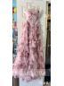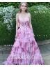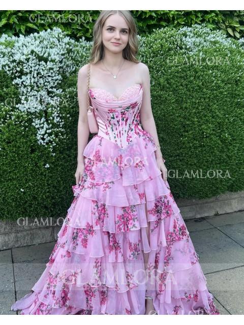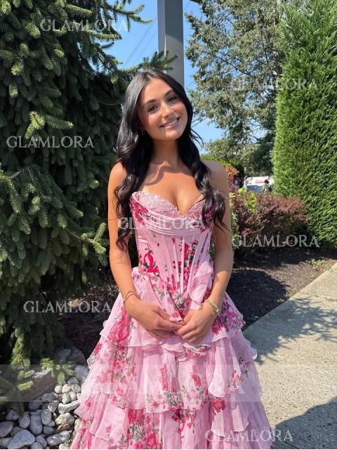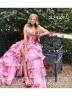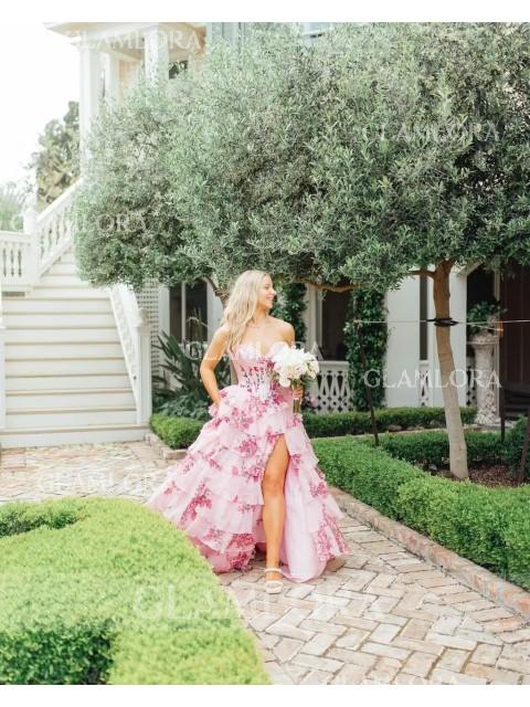 Pink Floral Strapless Satin Corset Ball Gown with Chiffon Ruffle Skirt Slit Prom Prom Dress