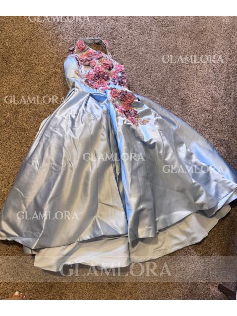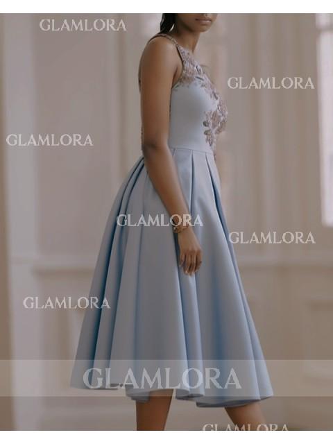 Ball-gown satin dress with one-shoulder neckline and charming floral details, showcasing a graceful tea-length style.