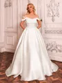 This stunning ball-gown wedding dress features a flattering scoop neckline and short sleeves adorned with delicate lace appliques. Crafted with a structured corset bodice for a flattering fit, it flows into a graceful sweep train, combining timeless elegance with a romantic, fairytale-inspired silhouette.