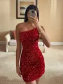 A sleeveless sheath dress with a one-shoulder neckline, embellished with sequins. The dress is made from velvet fabric and falls at a short/mini length.