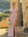 • Perfect Sheath V-Neck Short Sleeves Pleated Floor-Length Stretch Crepe Bridesmaid Dress