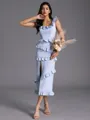 This tea-length bridesmaid dress features a sleek sheath silhouette and an elegant off-the-shoulder neckline. The sleeveless design is complemented by delicate ruffles, adding a touch of sophistication and femininity. Crafted from stretch crepe fabric, it ensures a comfortable and flattering fit. Perfect for a bridesmaid who desires a chic and modern look for the wedding.