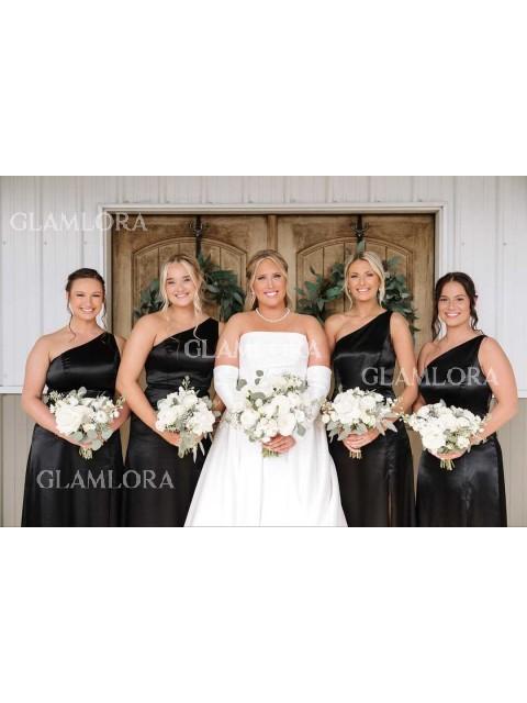This A-line bridesmaid dress features a chic one-shoulder neckline and sleeveless design for a modern, elegant look. Crafted from smooth silk-like satin, it offers a luxurious finish and graceful drape. The floor-length skirt creates a flattering silhouette-perfect for plus size bridal parties.