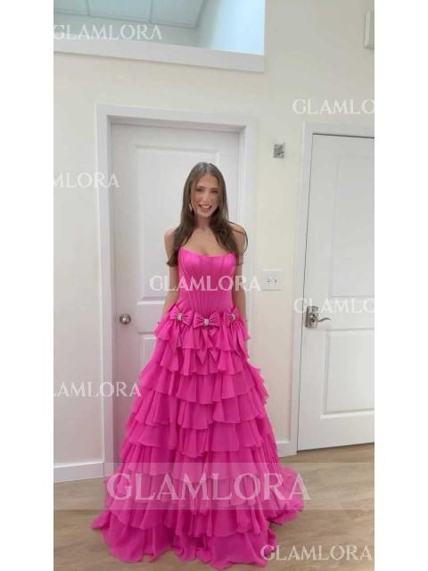 An elegant A-line straight dress crafted from lightweight 30D chiffon, featuring a sleeveless design and a flattering corset bodice. A charming bow accent adds a touch of femininity, while the sweep train enhances its graceful silhouette. Perfect for formal occasions or romantic events.