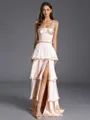 This beautiful A-line bridesmaid dress features delicate straps and a sleeveless design, offering a graceful and feminine look. Made from silk-like satin, it drapes elegantly, with cascading ruffles that add movement and charm to the floor-length silhouette. Perfect for weddings and formal occasions, this dress combines elegance with a soft, romantic appeal.