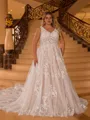 This elegant plus size A-line wedding dress features a flattering V-neckline and sleeveless cut, beautifully adorned with delicate lace appliques. The soft tulle skirt flows gracefully into a dramatic cathedral train, creating a romantic and timeless bridal look that enhances every curve.