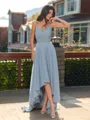 An A-line chiffon bridesmaid dress featuring a V-neckline and stylish pleats, with an asymmetrical hem for a modern touch.