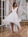 Beautiful A-line wedding dress with a V-neck and sleeveless design. The gown features delicate pleats and an asymmetrical cut, crafted from elegant tulle, creating a charming and modern bridal look.