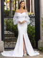 • Radiant Sheath/Column Stretch Crepe Ruched Off-the-Shoulder Long Sleeves Sweep/Brush Train Wedding Dress