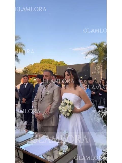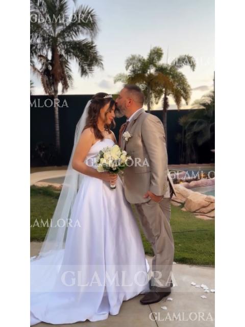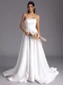 The A-line Straight Sleeveless Pleated Chapel Train Wedding Dress in Satin offers a timeless and elegant look for brides. With its classic A-line silhouette, straight neckline, and sleeveless design, this dress exudes sophistication and grace. The pleated detailing adds texture and dimension to the luxurious satin fabric, creating a refined and polished look. The chapel train adds a touch of drama and grandeur, perfect for a formal wedding ceremony. Ideal for brides who seek timeless elegance, this dress ensures the bride makes a stunning statement while feeling beautiful and confident on her special day.
