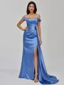 • Regal Sheath Off-the-Shoulder Pleated Sweep Train Silk Like Satin Bridesmaid Dress