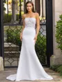 Make a statement in sophistication with this sheath wedding dress, featuring a straight silhouette and sleeveless design adorned with delicate lace appliques. Crafted from luxurious satin, it drapes gracefully to the floor with a sweeping train. Perfect for the bride who desires timeless elegance and modern allure on her special day.