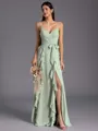 The A-line V-neck Sleeveless Ruffles Floor-Length Bridesmaid Dress in Chiffon is a beautiful and graceful option for bridal parties. Featuring an A-line silhouette, flattering V-neckline, and sleeveless design, this dress exudes timeless elegance. The cascading ruffles add a touch of romance and movement to the chiffon fabric, creating a soft and ethereal look. Perfect for weddings or special occasions, this dress ensures bridesmaids feel enchanting and beautiful throughout the celebration.