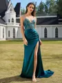 Rhythmic Sheath V-Neck Pleated Sweep Train Silk Like Satin Corset Prom Dress