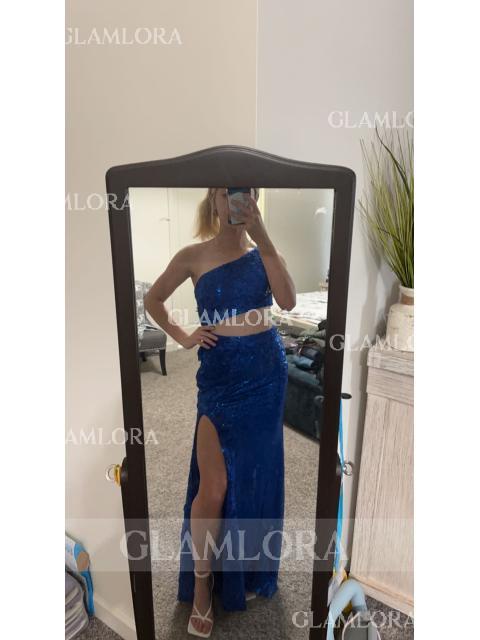 • Scintillating Sheath/Column One-Shoulder Sleeveless Sweep Train Sequins Prom Dress With Slit