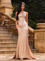 A glamorous sheath prom dress featuring spaghetti straps and a sleeveless design embellished with sparkling rhinestones. Flowing into a graceful sweep train, it creates a sleek and elegant silhouette perfect for formal events and special occasions.
