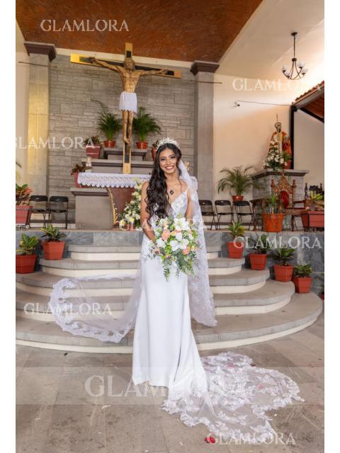 Radiate elegance in this sheath wedding dress, featuring a V-neckline, sleeveless design, and intricate lace appliques. Crafted from stretch crepe fabric, it boasts a stunning cathedral train and a flattering corset bodice.
