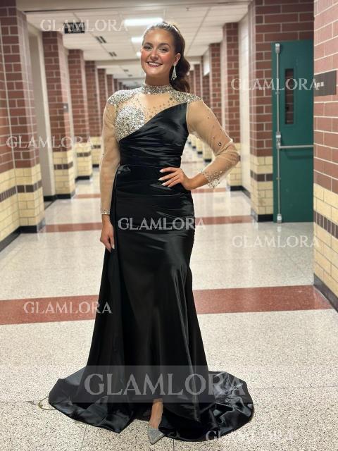 • Sheath/Column Glam High Neck Long Sleeves Sweep Train Silk like Satin Evening Dress With Rhinestone