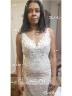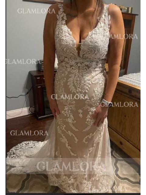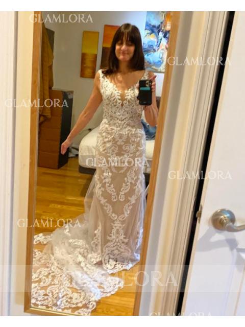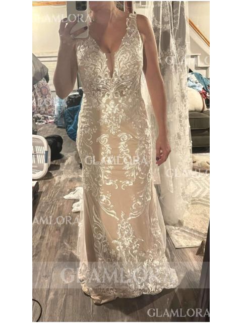 1.This stunning wedding dress features a sheath silhouette with a flattering V-neckline and sleeveless design, adorned with intricate lace applique.