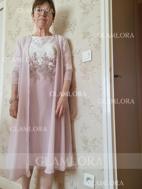 1.This mother of the bride dress features a sheath silhouette with a bateau neckline, 3/4 sleeves, applique detailing, and a knee-length chiffon skirt. It offers an elegant and refined look for the mother of the bride.