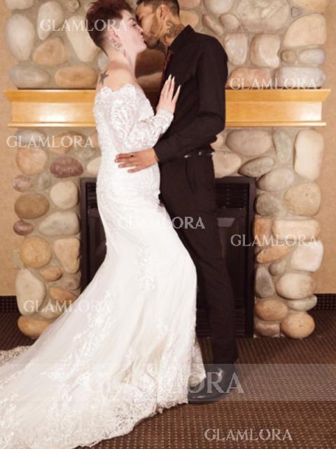 • Sheath/Column Off-the-Shoulder Long Sleeves Court Train Glamourous Lace Wedding Dress