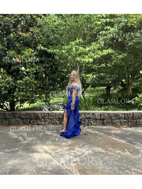 • Sheath/Column Off-the-Shoulder Sleeveless Sweep Train Sexy Silk like Satin Corset Prom Dress With Slit