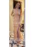 • Sheath/Column One-Shoulder Sparkly Sleeveless Sweep Train Velvet Sequins Prom Dress With Slit