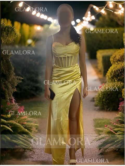 • Sheath/Column Straight-cut Spaghetti Straps Floor-Length Silk like Satin Corset Prom Dress With Slit